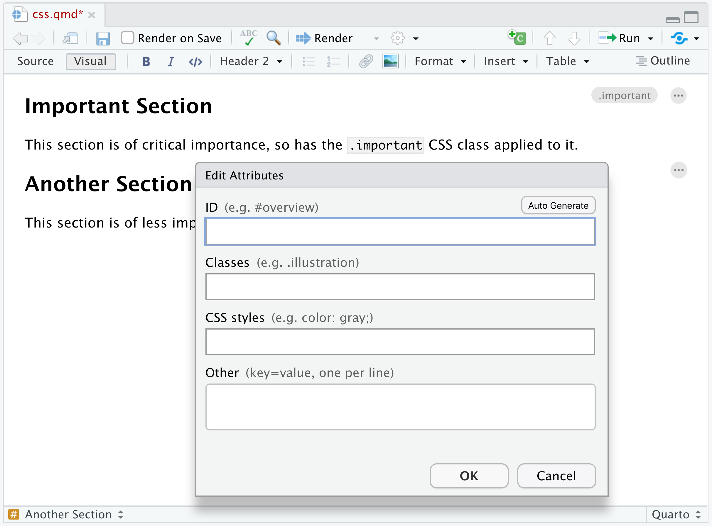 Note the presence of the .important class within the Edit Attributes dialog.